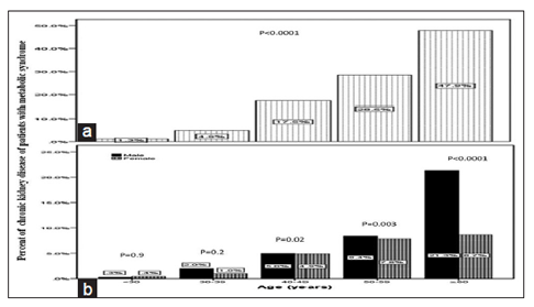 Figure 3: Percent of chronic kidney disease of patients with metabolic syndrome among age groups (a) and in correlation to gender (b)