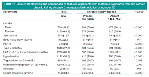 Worldwide, 10-15% of the population suffers from chronic kidney disease (CKD) [1,2]. CKD which is an increasingly important clinical and public health issue is associated with cardiovascular disease (CVD), and all-cause mortality [3,4]. The prevalence of CKD in Saudi population is around 5.1-5.7% [5,6]. Therefore, prevention and management of CKD by identifying and treating its risk factors are of critical urgency. Metabolic syndrome (MetS), which is characterized by high fasting glucose levels, high blood pressure, being overweight, abdominal obesity, hypertriglyceridemia, and low high- density lipoprotein cholesterol (HDL-C) levels, is prevalent worldwide, and its incidence is growing at an alarming rate annually [7]. Epidemiologic studies have also linked MetS with an increased risk of incident CKD [8,9]. The increase in the incidence of CKD has been paralleled with a rising prevalence of MetS in recent years. Obesity plays a particularly central role in the pathomechanisms of MetS and raises the risk for CKD by about 4-fold. The two chief risk factors for end- stage renal disease, hypertension (HTN), and Type 2 diabetes (T2DM) are both linked to MetS and obesity [10,11]. Previous studies have documented that MetS and CKD share similar risk factors, and both of them are also independent risk factors for CVD [12,13]. The MetS is also an important predictor of early renal dysfunction and the odds ratio (OR) of CKD and microalbuminuria increase with the number of MetS components [12,14]. Prospective data have demonstrated the impact of MetS on the evolution of CKD and highlighted the importance of targeting MetS for prevention of renal disease and premature death [15]. Therefore, the present study was designed retrospectively to find the prevalence and potential risk factors of CKD in patients with MetS in Saudi Arabia.