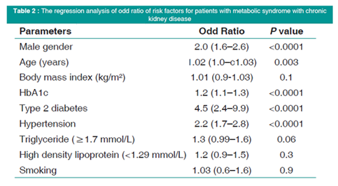 In our study, the overall prevalence of CKD in patients with MetS was 28.3%. MetS, previously called "syndrome X," is a term in popular use for the past quarter century, having first been described in 1988 by Reaven to denote a combination of selected, widely prevalent CVD related risk factors [7]. Many studies associate MetS with CKD [8,21-32]. MetS and CKD share a complex, bidirectional relationship. Data from the multiethnic study of atherosclerosis reported that the combination of CKD and MetS is a strong predictor of incident cardiovascular events (myocardial infarction, cardiac arrest, angina, stroke, and cardiovascular-related death) with an adjusted hazard ratio 5.56 (95% CI 3.72-8.12).